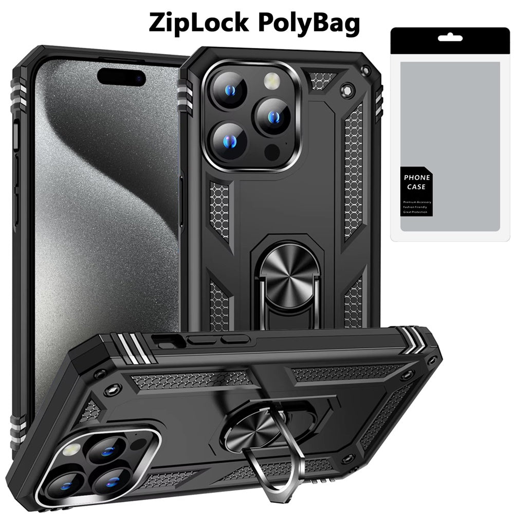 Protect and elevate your iP15 Pro Max with our durable Phone Case. Featuring a convenient ring magnetic kickstand, this hybrid case provides both functionality and style. The black polybag adds a touch of color and extra protection. Upgrade your phone's look and use with our Phone Case.
